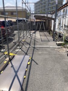 解体する建物のすぐ横に駐車場があります。飛散物が車にあたらないように、足場養生を組んでいる状況です。