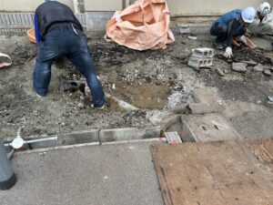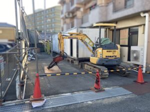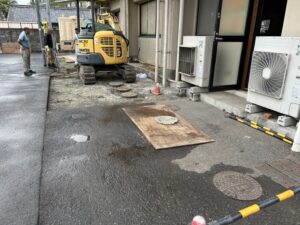 地中の埋設配管・電線・会所升は残す条件で工事を進めています。それらを重機で損傷させないように、