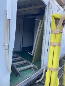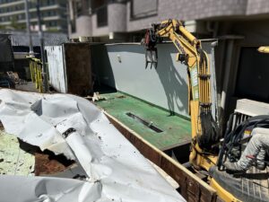 床を解体している状況です。重機の間合いを考慮して、二つのユニットを屋根→壁→床の順序で解体して、進んでいきます。ウレタンは引火しやすいので、