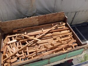 樹脂製の波板屋根をはがした後、木製下地を手解体している状況です。隣接建物が引っ付いているため、慎重にはずして行きます。
