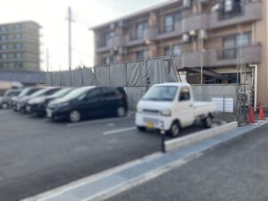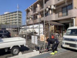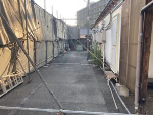 解体する建物のすぐ横に駐車場があります。飛散物が車にあたらないように、足場養生を組んでいる状況です。