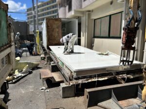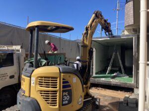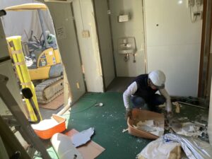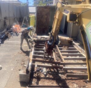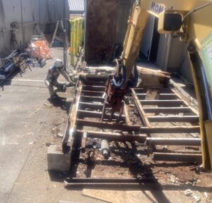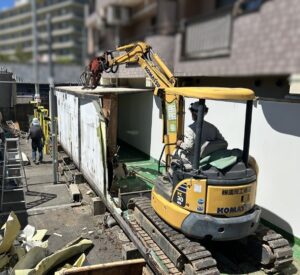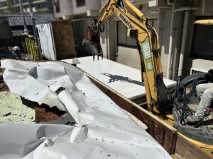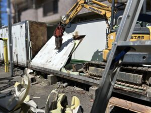 床を解体している状況です。重機の間合いを考慮して、二つのユニットを屋根→壁→床の順序で解体して、進んでいきます。ウレタンは引火しやすいので、