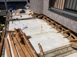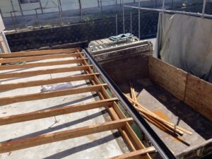 樹脂製の波板屋根をはがした後、木製下地を手解体している状況です。隣接建物が引っ付いているため、慎重にはずして行きます。