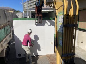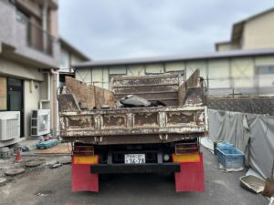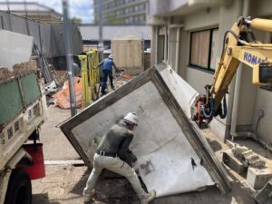 切ったパネルはダンプに整然と積み込んでいきます。外壁の設備器具を取り外しているので、綺麗に積み重ねることができました。