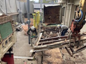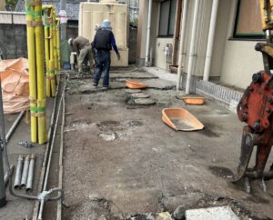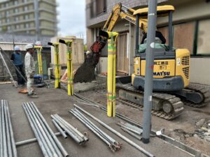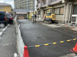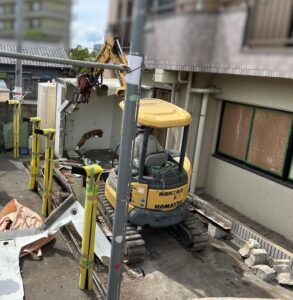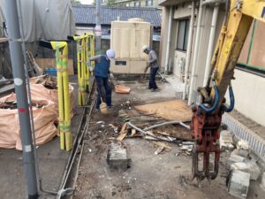 地中の埋設配管・電線・会所升は残す条件で工事を進めています。それらを重機で損傷させないように、