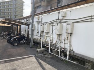 外壁に設置されていた給湯器等の設備器具を、はずした状態です。